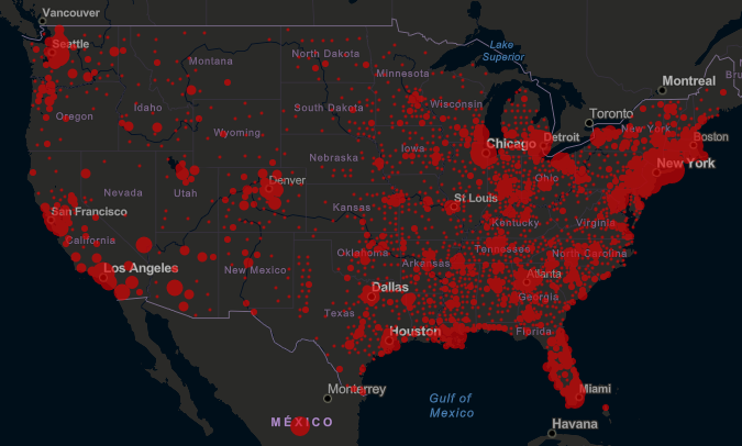 현재 미국 지역별 확진자 발생 분포도 입니다.