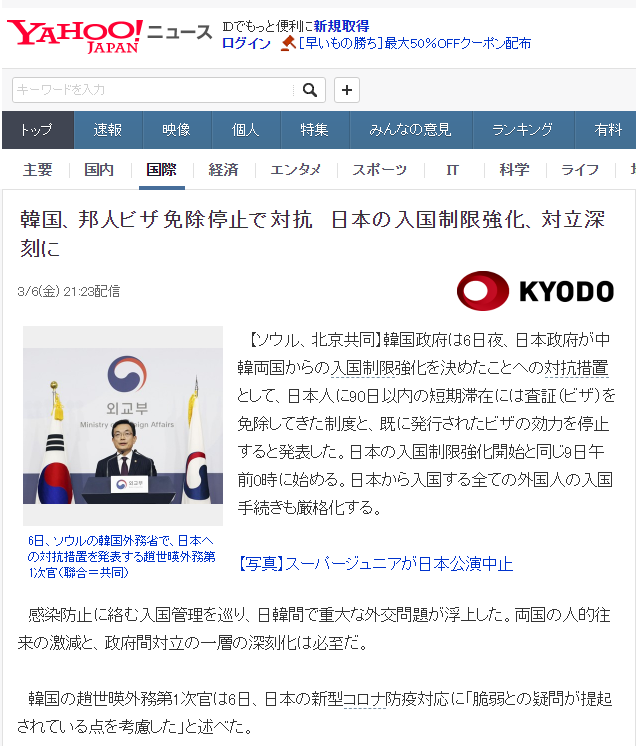 【기사 번역】 한국 정부는 6 일 밤 일본 정부가 한중 양국의 입국 제한 강화를 결정한 것에 대한 대항 조치 로서 일본에 90 일 이내의 단기 체류 사증 (비자) 면제 온 제도와 이미 발급 된 비자의 효력을 정지한다고 발표했다. 일본의 입국 제한 강화 시작과 동일한 9 일 자정에 시작한다. 일본에서 입국하는 모든 외국인의 입국 수속도 엄격화한다.